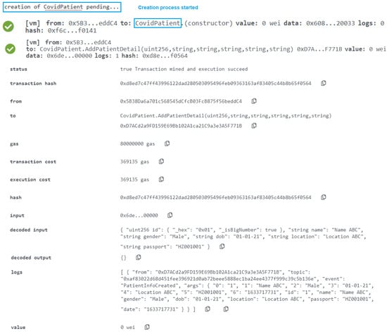 The user who is allowed in the CovidCenter can enter the details of patients who arrive for testing or immunization. As seen in Figure 10, the function was successfully completed, and the event now has the time in uint256. Any of the COVID-19 Testing/Vaccination Center’s patients can get updates. In order to make sure that the event generated as an announcement notice has all the necessary information, the function CovidPatientRecord was successfully assessed. The timing of the announcement, the information that must be broadcast, the patient’s smart contract address, the patient’s Ethereum address, and other data are shown in Figure 10.