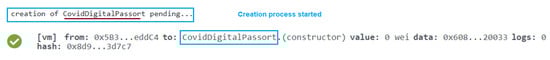 The data is saved in the blockchain using a smart contract, and the required parameters are provided using the “AddDigitalPassport” function (see Figure 4d). The mapping is used to retrieve the list of all patients’ certificates using passport numbers. The “DigitalPassportCreated” event is then generated.