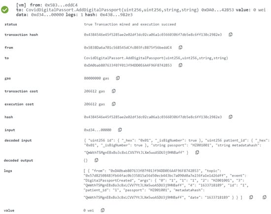 Following the collection of the COVID-19 lab test results, the function AddDigitalPassport was executed (see Figure 11). The event contains the Ethereum addresses of COVID-19 test and immunization participants, as well as the smart contract addresses, the IPFS hash of the test results, and the moment the event was published. The logs and event information are shown in the diagram above. When the digital health passport certificate is uploaded to IPFS storage, it generates a hash, which is then saved in a blockchain ledger with other patient information. Using the patient’s passport number, the patient can download a digital health passport from any location. The details of the patient can be verified immediately by the other linked and mentioned nations.