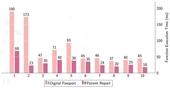 The amount of time needed to obtain data from the IPFS and blockchain is shown in Figure 13. The digital passport bar displays the time spent more than accessing the patient report. The digital passport is uploaded into IPFS and then saved into the blockchain ledger along with the patient’s file hash and other necessary information, while the patient report is merely kept in text form as a text on the blockchain ledger.