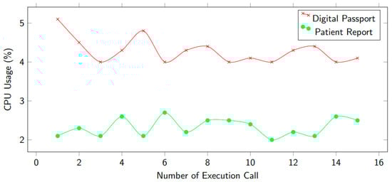 In Figure 14, we depict the consumption of CPU utility while executing functions using smart contracts. There are various techniques including calling encryption data, storing in IPFS, and recording in the blockchain ledger. These tasks were completed in one cycle, after that we measured the CPU % usage. The decryption technique used the CPU much less. Figure 11 shows two scenarios: digital passport and patient report. It can be noticed that CPU consumption is higher for a digital passport.