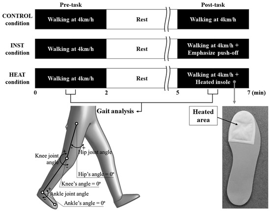 Figure 2). This task was performed on three different days under the following three conditions. CONTROL condition: The participants walked as usual with a polyurethane insole in the shoe both pre- and post-task. INST condition: The pre-task was the same as in the control condition, walking normally; post-task, the participant was instructed to extend the stride with a push-off from the ball of foot to the toe. HEAT conditions: The pre-task was the same as in the control condition, walking normally; post-task, the insoles were replaced with modified ones during the break. A disposable warmer was attached to the area from the ball of foot to the toe of the insole and was heated (