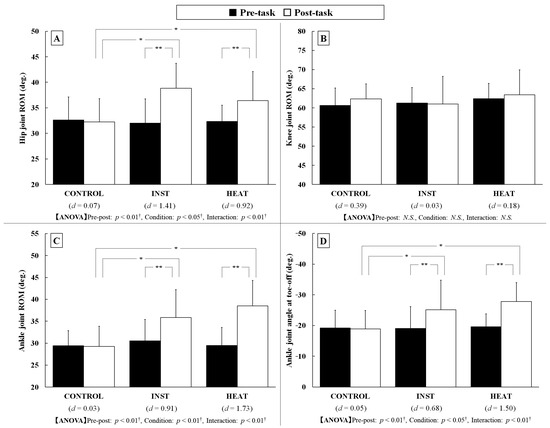 f = 1.25). Multiple comparisons in the hip angle ROM indicated significant increases in post-task compared to pre-task under the INST and HEAT conditions, with large effect sizes (