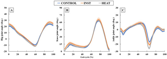 d > 0.90). Angular displacements in the sagittal plane of these three lower limb joints (hip, knee and ankle) for the CONTROL, INST and HEAT conditions in post-task are shown in