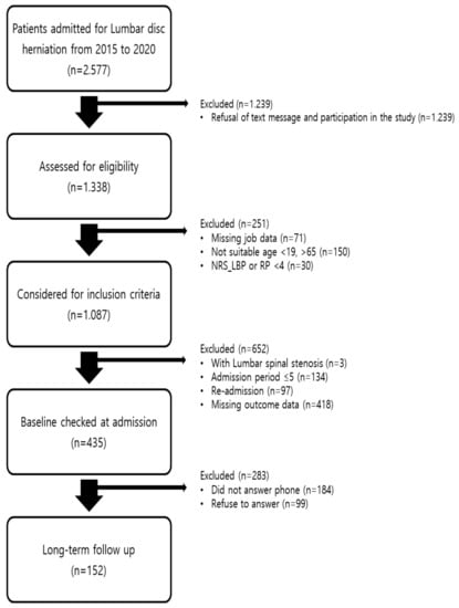 From 1 January 2015 to 31 December 2020, patients who were diagnosed with LDH and hospitalized in three Jaseng Hospitals of Korean medicine (in Gangnam, Bundang, and Ulsan in Korea), spine, and joint hospitals were included. Among the participants who met the inclusion/exclusion criteria, those who agreed that their personal information could be used for study purposes at the time of admission were included in the study.
