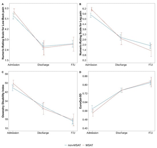 The values of outcomes (NRS for LBP, NRS for radiating leg pain, ODI, and EQ-5D-5L) measured at admission, discharge, and follow-up are expressed as the mean ± SD. The change from baseline is presented as a 95% confidence interval (CI) using a linear mixed model. In the linear mixed model, participants were included as random effects, and time was included as a fixed effect. Time was calculated using categorical variables. The baseline outcomes were also corrected. In addition, to calculate the proportion of change at each time point, a linear mixed model including the cross terms of time and MSAT status was utilized. The changes in outcome values from baseline to discharge and follow-up of each group are expressed as the least square means and 95% CI, which were estimated using a linear model. The baseline outcomes of the two groups are expressed as the mean ± SD.