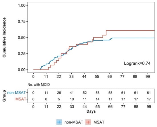 This study used SCB to determine improvement in pain, and the SCB for the NRS score for LBP was set to 2.5 points. The score that reached this number was considered significantly improved. Survival analysis was performed for achievement of SCB for NRS score for LBP, and the median survival times in the MSAT and n-MSAT groups were 56 (95% CI 31 to NA) days and 529 (95% CI 43 to 1205) days, respectively. The log-rank test result was 0.74 with a hazard ratio of 1.09 (95% CI 0.70 to 1.80; p = 0.74), indicating no significant difference between the two groups (Figure 3).