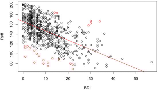 Ryff score as a function of BDI score. The straight red line marks the linear tendency and red circles the scores classed as outliers. Red points below the straight line belong to individuals whose Ryff score is too low for the BDI that they exhibit, while those over the straight line represent individuals with excessively high Ryff levels.