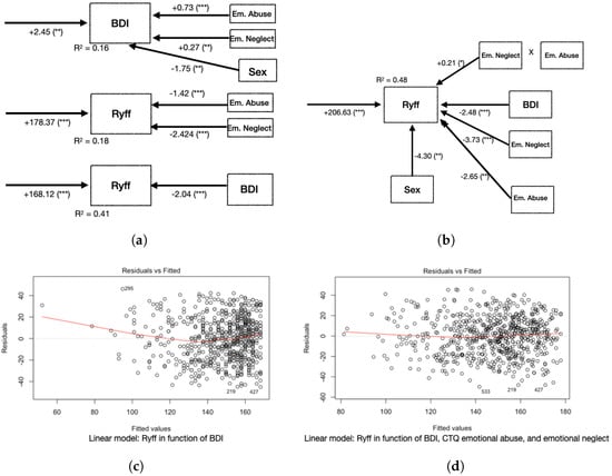 According to the linear model that we obtained for , each one-unit increase in the BDI entails a 2.48-unit decrease in the Ryff, each one-unit increase in CTQ Emotional Neglect leads to a 3.73-unit decrease in the Ryff, and each one-unit increase in CTQ Emotional Abuse results in a 2.65-unit decrease in the Ryff. The interaction (product) between Emotional Abuse and Emotional Neglect is significant, too (coefficient ); see Figure 2b Sex is also significant: if the participant is a man, the Ryff decreases by 4.3 units. A comparison of residuals shows that the inclusion of the CTQ’s emotional dimensions leads to a decrease in residuals and improves fit, in particular for extreme Ryff values (Figure 2c,d).