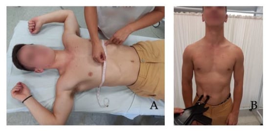Thorax Circumference in maximum inspiration at the level of the xiphoid process (A). Abdominal skinfold test (B).