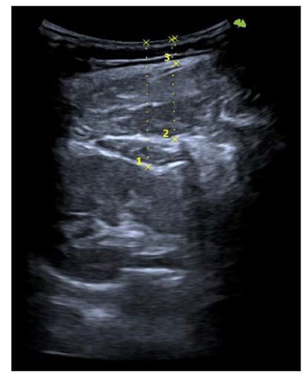 Ultrasonography image. Short-axis measurements in L2 level, left side at rest. Skin-kidney (1), skin-iliocostalis lumborum bottom edge (2), and skin-iliocostalis lumborum top edge (3).