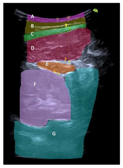 Ultrasonography image. Short-axis view: skin (A), fat (B), thoracolumbar fascia (C), iliocostalis muscle (D), quadratus lumborum muscle (E), kidney (F), and peritoneum (G). Skin-kidney (1), skin-iliocostalis lumborum bottom edge (2), and skin-iliocostalis lumborum top edge (3).