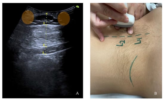 Ultrasonography image. Long-axis measurements in L2 level, left side at rest. Skin-kidney (1), skin-iliocostalis lumborum bottom edge (2), and skin-iliocostalis lumborum top edge (3) with the finger’s acoustic shadow painted (orange) (A). Moment of the sampling technique (B).