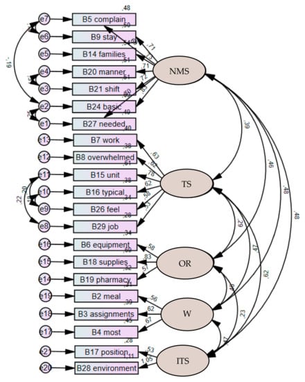 In the EFA, items 1, 10, 11, 12, 13, 22, 23 and 25 did not meet the criterion of factor loading greater than 0.40, and so they were excluded. In the Portuguese version of the IWPS-R, 62.3% of the total variance was explained by five extracted components. This version is composed of 21 items in five dimensions: “Nurse Manager Support” (NMS) with seven items; “Team Support” (TS) with six items; “Organizational Resources” (OR) with three items; “Workload” (W) with 3 items; “Intent to Stay” (ITS) with two items (Table 2). We considered it crucial to keep the standpoint of Cox et al. [18]. Accordingly, we maintained the dimensions’ names, only adjusting the semantics and meaning of the dimension “Organizational Resources”.