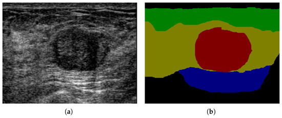 Breast anatomy: (a) BUS image; (b) ground truth; green: fat layer, yellow: mammary layer, blue: muscle layer, red: tumor, and black: background.