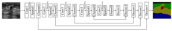 Comparing with CT, MR, X-Ray imaging, ultrasound imaging is harmless, low cost, and potable. Breast ultrasound (BUS) imaging is one of the most important modalities for breast cancer early detection [12,13]. However, BUS images are usually in low contrast, and poor quality and have inherent speckle noise and shadows [14]. It is critical to develop computer-aided diagnosis systems for breast ultrasound images, especially for breast anatomy segmentation (multi-category BUS semantic segmentation). The location relation between breast tissues and the tumor can provide important context information in breast cancer diagnosis (shown in Figure 1). For example, the tumor region (red) is much more likely located in the mammary layer (yellow) than in other layers. The breast anatomy can also provide important information for breast density calculation which has high correlation with cancer risk [15]. There are only few researches in multi-category BUS semantic segmentation because most BUS image datasets only contain ground truths for tumors. In [16], U-Net was applied to BUS image segmentation with three categories: tumor, mammary layer, and background. The location relation between the mammary layer and the tumor was employed to refine the segmentation results. An encoder-decoder network with deep boundary regularized constraint, and adaptive domain transfer was proposed [17] to segment four layers in BUS images. In [18], a deep learning method based on a self-attention mechanism was proposed for breast anatomy layer segmentation.