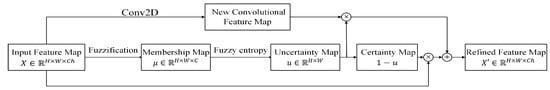 After reducing the uncertainty in pixels, the uncertainty in channels is processed by the proposed CFBs. Motivated by the channel-wise attention mechanisms [44,45] and fuzzy logic, the CFB utilizes the fuzzy entropy to measure the uncertainty degree of the channels of feature maps. An uncertain channel is a channel with higher fuzzy entropy (close to 1). There are also three major components in the CFB: fuzzification, uncertainty representation, and uncertainty reduction (Figure 4).