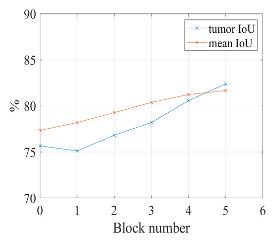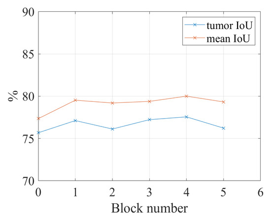 In order to show the increasing performance in Figure 6 is caused by the fuzzy blocks in deeper convolutional blocks or the combination of the former fuzzy blocks and the newly added fuzzy blocks, another experiment is conducted. In this experiment, the fuzzy blocks are added to the five convolutional blocks of ResNet-101 individually. For example, the fuzzy blocks are added to the second convolutional block of ResNet-101; there is no fuzzy block in convolutional blocks 1, 3, 4, and 5. The experiment results in Figure 7 show that there is a slight increase in performance when applying fuzzy blocks to convolutional blocks 1 to 5; however, the performance cannot outperform the performance of using fuzzy blocks in five convolutional blocks together. When we only add a fuzzy block to the fourth convolutional block, the IoU for the tumor is the highest, which is 77.56%; however, when we add fuzzy blocks to all five convolutional blocks, the IoU for the tumor is 82.40%. Therefore, the spatial and channel-wise fuzzy blocks are applied to five convolutional blocks in the following experiments.