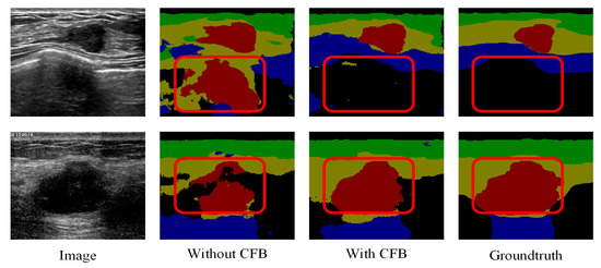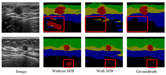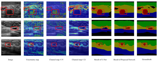 First, the proposed SFBs and CFBs are individual blocks that do not depend on network structures. They can be easily integrated into different network structures, such as VGG-16 and ResNet. Most other attention mechanisms are either designed with new network structures or have limitations when applied to other networks. Second, as shown in Table 2, the proposed SFBs and CFBs can be used with different networks, and removing either block will lead to worse performance on BUS image segmentation. That is because the SFBs and CFBs can both find the fuzzy regions and channels in the feature maps and reduce their weights, refers to Figure 10. Third, our SFBs and CFBs can also be used in the semantic segmentation of other datasets besides BUS images. Fourth, in Section 4.5.2, we prove that the proposed SFBs and CFBs can help detect small tumor regions. Small tumors and low-intensity background regions have high uncertainty degrees (Figure 10). We focus on those uncertain regions and refine their feature maps to get better segmentation results.