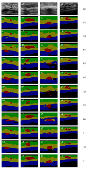 Small tumor segmentation: (a) original images; (b) ground truths; (c) results of ResNet-101 with self-attention mechanism; (d) results of a SE-Net (ResNet-101); (e) results of attention U-Net; (f) results of ResNet-50; (g) results of ResNet-101; (h) results of Deeplab; (i) results of PSPNet; (j) results of U-Net with wavelet transform; and (k) results of FCN-8s; (l) results of proposed method.