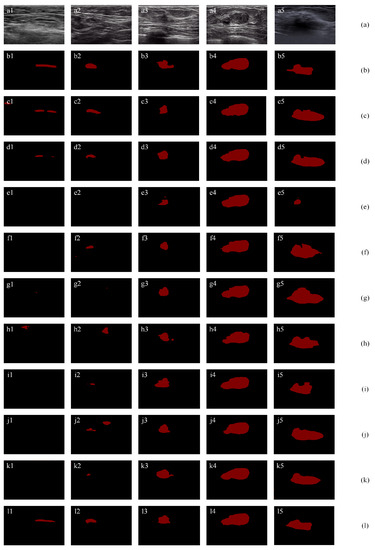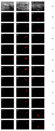 In this section, we show the effectiveness of the proposed method on small tumor segmentation. Small tumors are hard to segment due to their small size, low intensity, and tumor-like regions in BUS images. Figure 13a1 contains a very small tumor. The proposed method (l1) achieves the highest TPR, JI, and DSC values of 92.78%, 81.82%, and 90.00%, and the lowest AER value of 20.62%. It improves the second-best method by 1.12%, 1.78%, 0.98%, and 0.54% in terms of TP, JI, DSC, and AER, respectively. Figure 13a2 contains a small tumor close to a tumor-like region. Most existing methods mistakenly classify the tumor-like region. The proposed method (l1) achieves the highest JI and DSC values of 85.11% and 91.95%, and the lowest AER value of 16.91%. It improves the second-best method by 5.16%, 2.78%, and 14.64% in terms of JI, DSC, and AER, respectively. Figure 13a3 contains a small tumor that is located in a region in low intensity, which makes it hard to be distinguished from the background. The proposed method (l1) achieves the highest JI and DSC values of 70.63% and 82.79%, and the lowest AER values of 39.50%. It improves the second-best method by 9.75%, 5.71%, and 17.16% in terms of JI, DSC, and AER, respectively. It is due to the fact that the small tumor contains similar feature values with noise patches or background patches. However, the proposed method achieves the best results in small tumor images; therefore, it can achieve the best overall performance on all datasets.