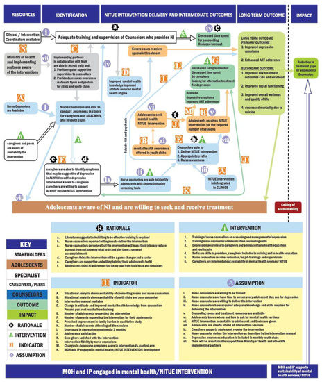 The outcome indicates the primary effect of the intervention. Adolescents and health care providers mentioned improvement in depressive symptoms and enhanced adherence for adolescents living with HIV as the outcome of interest. In addition, all participants indicated other outcomes such as improved academic performance and quality of life as defined by good health, making it easy to enjoy life and attain individual life goals. Stakeholders noted that the final impact of the intervention would be to reduce the treatment gap for adolescent depression.