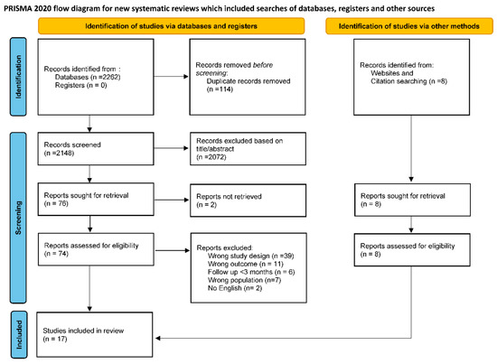 The systematic search identified 2262 publications, and 8 additional publications were retrieved from other sources, including citation search and websites. After removing duplicates, two researchers (SP and CC) independently screened 2156 titles and abstracts, then read 84 full texts. 17 articles were selected that met the inclusion criteria (Figure 1). Primary reasons for exclusion of the studies included: (1) the publication presented data from post-COVID adults or children with specific comorbidities (e.g., multisystemic inflammatory syndrome, asthma, diabetes, etc.); (2) the publication’s follow-up time was less than 3 months aster infection; (3) the study did not present primary data (e.g., opinion, protocol, etc.); (4) the article did not present the effect of COVID-19 on any of the inclusion outcomes; and (5) the full text of the article was unavailable in English.