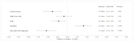 In unadjusted analyses (Table 3), SNF LOS decreased among BPCI hospitals from an average of 8.9 days in the pre-bundled payment period to 8.4 in the bundled payment but increased among non-BPCI Hospitals from an average of 7.6 to 7.8 days between the pre-bundled payment and bundled payment periods, respectively. In adjusted difference-in-differences (aDID) analysis (Figure 1), BPCI participation was associated with a differentially lower in SNF LOS among frail patients (aDID −0.4 days versus non-frail patients, 95% CI −0.8 to −0.1 days, p = 0.01), patients with advanced age (aDID −0.8 days versus younger patients, 95% CI −1.2 to −0.3 days, p = 0.001), and patients with prior SNF/IRF utilization (aDID −1.1 days versus patients without prior utilization, 95% CI −1.6 to −0.6 days, p < 0.001). BPCI participation was also associated with differentially greater SNF LOS among disabled patients (aDID 0.8 days versus non-disabled patients, 95% CI 0.4 to 1.2 days, p < 0.001).