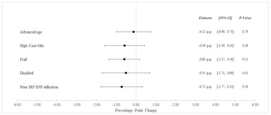 In unadjusted analyses, there were changes in secondary outcomes between the pre-bundled payment and bundled payment periods (Table S3). Differential changes were also observed for some outcomes in adjusted analyses (Figures S1–S4). In particular, BPCI participation was also associated with differentially lower post-discharge spending for frail patients (aDID −$401 versus non-frail patients, 95% CI −$682 to −$120, p = 0.01) and patients with prior SNF/IRF utilization (aDID −$534 versus patients without prior utilization, 95% CI −$922 to −$145, p = 0.01). BPCI participation was associated with differentially lower mortality for disabled patients (aDID −0.66 percentage points [pp] versus non-disabled patients, 95% CI −1.27 to −0.06 pp, p = 0.03) and differentially greater discharge to SNF/IRF for frail patients (aDID 1.05 pp versus non-frail patients, 95% CI 0.28 to 1.82 pp, p = 0.01).