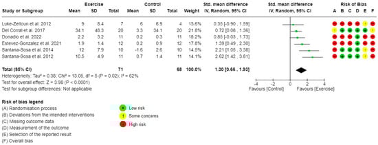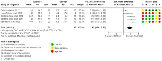 Forest plot for comparisons and risk of bias: Exercise versus Control, Outcome 1: Upper limb muscle strength.
