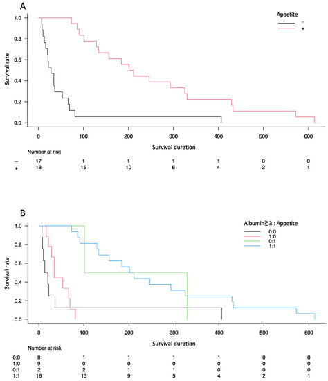 The patients were divided into two groups: with and without appetite loss. Student’s t-test was performed on parametric data, and the Mann–Whitney U test was performed on non-parametric data. Cumulative event-free survival rates were calculated using the Kaplan–Meier method, analyzed using the log-rank test, and stratified by factors with statistically significant differences between the groups. Patients with missing data were excluded from the analysis. Regarding the sample size calculation, 30 participants were determined to provide 80% statistical power and 5% type 1 error to detect a significant difference between two survival curves of patients with survival rate of 0.05 and 0.5 in the group with appetite loss and no appetite loss, respectively [15]. Statistical significance was set at p-value < 0.05. All statistical analyses were performed using EZR (Saitama Medical Center, Jichi Medical University, Saitama, Japan), a graphical user interface for R (The R Foundation, Vienna, Austria) [24].