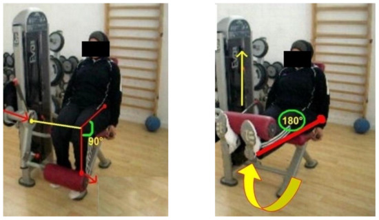 During the first position, the tibia moved from a normalized 90° starting position at the knee until full extension. This concentric phase was completed when the legs reached 180° and took a ground position. In the end, the tibia has taken its initial position at 90° (Figure 1). During the second position, the tibia was moved from a 180° starting position to a 90° knee flexion. When the tibia returned to its initial position of 180°, the eccentric phase was checked, and a full repeat was performed (Figure 2). All participants were given standard verbal encouragement during each MVC and visual feedback of the produced force was provided.