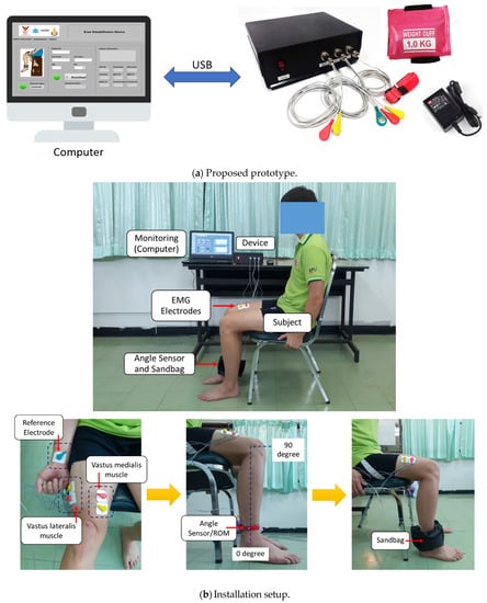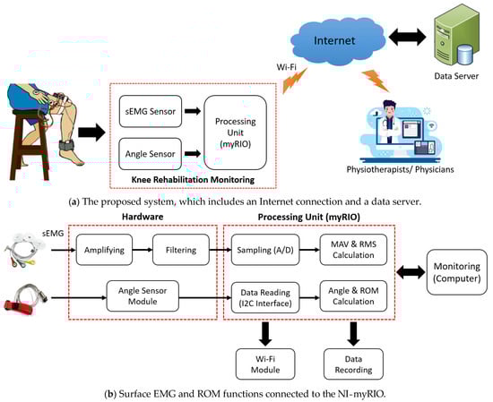 The proposed system and the prototype developed in this work are illustrated in Figure 1 and Figure 2, respectively. The installation setup for experiments is also demonstrated in Figure 2. As in Figure 1, the proposed system consists of three major functions, including (a) two-channel surface EMG signal measurement and processing using the developed EMG device set, (b) knee ROM measurement using the accelerometer device set (or the angle sensor module in the figure), and (c) the knee rehabilitation program for users using the LabVIEW program with the GUI on the NI-myRIO embedded device (a processing unit). Note that both (a) and (b) are connected together and processed by the NI-myRIO. The NI-myRIO was used because it is a high-performance embedded device that can be efficiently applied for large data processing and also for supporting IoT and machine learning (our future work). The system can also connect to the database and Web servers through the Internet connection for monitoring and evaluation, while the physical therapists and physicians can plan the treatment using the Internet connection system [25,26]. The details of the proposed functions are described as follows.