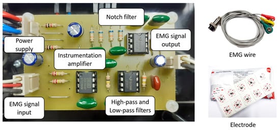 To measure the EMG signals, we developed an EMG circuit (as put in the control box and connected to the NI-myRIO device in Figure 2) for two-channel EMG signal measurement of VL and VM muscles. The block diagram and the implemented circuit with the electrodes are shown in Figure 3 and Figure 4, respectively. As in Figure 3, raw EMG signals are gathered by the electrodes attached to the related muscles. These raw signals are first amplified using the instrumentation amplifier. We note that the reference drive, as connected to the reference electrode, is used as a reference for the amplifier circuit. The signals are then filtered using high-pass, low-pass, and notch filters, respectively. Here, the high-pass filter is used for gathering the high-frequency signals, where a 10 Hz cut-off frequency is applied to remove low-frequency signals caused by the effect of electrode wire movement (motion artifacts) and human effects. The low-pass filter is also applied to reduce noise at high frequencies with a cut-off frequency of 500 Hz caused by physical environments, while the 50 Hz cut-off frequency (AC base-line) can be removed by using the notch filters. With our solution and circuit development, the measured EMG signals are pre-preprocessed, and the output EMGs are the optimal signals by hardware. This can help to reduce the complexity of the preprocessing stage from a software processing perspective.