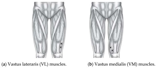 The electrodes are attached to the skin beyond the VL and VM muscles, as presented in Figure 2. Figure 5 also shows the electrode placements. The VL muscle is positioned on the thigh’s lateral side. This muscle is the largest and most strong part of the quadriceps femoris, and it serves to extend the knee joint, moving the lower leg forward. The VL muscle provides power for and absorbs the impact of activities such as walking, jumping, and running [27]. For the VM, it is an extensor muscle positioned medially in the thigh that extends the knee. The VM is part of the quadriceps muscle group. Knee pain is thought to be associated with quadriceps muscle weakness or fatigue, particularly in the VM [28,29]. Thus, both VL and VM muscles are targeted in rehabilitation because of their role in patellar stabilization during knee extension [30,31].