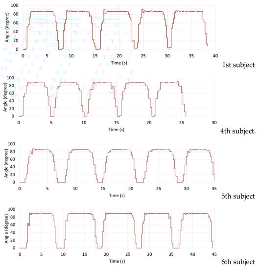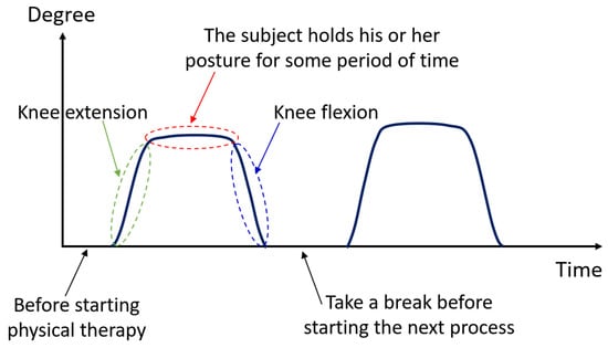 In our experiments, we defined that the subject begins with the starting position (0 degrees), and the subject then moves the knee to 90 degrees as the peak position (stretched out knee). For the 90-degree peak position of each subject (they can perform), we request the subject hold his or her posture for some period of time. This is called the duration of sustained contraction. Finally, the subject can return to the starting position and repeat the process again. As illustrated in Figure 7, the time before starting, the starting time, the time it takes from the initial degree to the maximum degree (i.e., peak position), the duration of sustained contraction, and the time it takes from the maximum degree to the initial degree, are demonstrated, respectively. As per our requirements, knee extension in terms of real-time ROM can be obtained and evaluated.