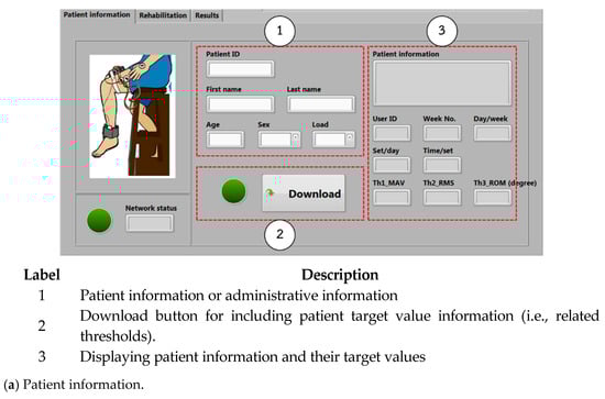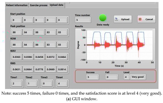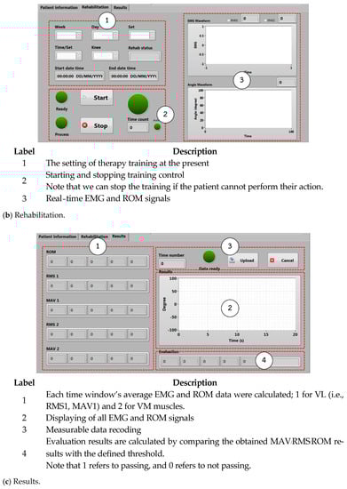 The graphical user interface or GUI using the LabVIEW program from the NI-myRIO embedded device is used for setting, collecting, and presenting the patient information, the EMG (including MAV and RMS), and ROM data. Moreover, a knee rehabilitation program designed by physical therapists and physicians can be configured and assigned. Figure 8 shows the GUI monitoring window. There are three major parts as in Figure 9, including (a) patient information, (b) rehabilitation, and (c) results, respectively.