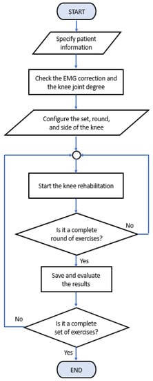 Figure 9 provides the summary of the work flow of the knee extension monitoring and rehabilitation system. The program starts with entering patient data into the system to retrieve any related data from the database. Then, the correct installation of the EMG electrodes and the angle sensor for ROM are checked by observing the signal displayed on the monitoring window. The number of repetitions of the physical therapy for each test, the number of tests, and the knee side to be tested are assigned. Here, the program immediately starts when the patient is ready for testing. The program automatically counts and checks the number of repetitions of the physical therapy. If the count is not reached, the patient is allowed to continue the action until the number of repetitions has been completed. Therefore, if yes, the EMG and ROM data of such a test are automatically recorded. Finally, when the number of tests reaches the defined level, all measured data are recorded and processed and the program stops when it completes the rehabilitation program. We note that the specification information of our proposed device and system is also provided in Table 2.