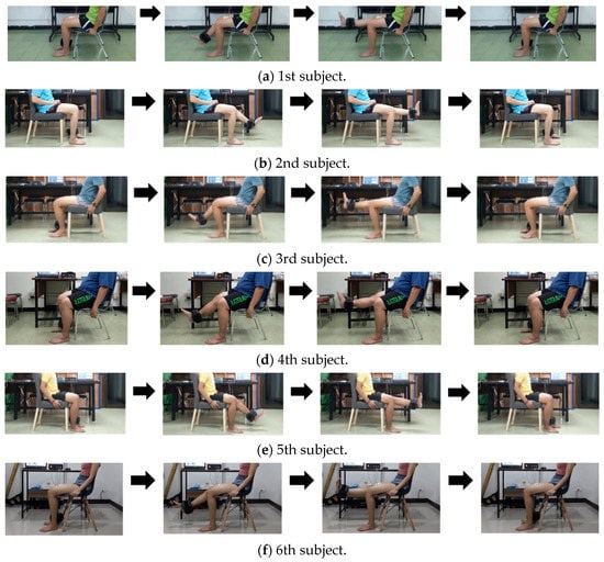 For the patients, as illustrated in Figure 12, the subjects are divided into two groups. The first group is composed of patients with bone and joint problems, including (a) knee osteoarthritis, (b) herniated disc, and (c) knee ligament injury. The second group is the patients with neurodegenerative and brain problems, including (a) ischemic stroke, (b) hemorrhagic strokes, and (c) patients with Parkinson’s disease. Here, these kinds of diseases can affect the movement of the knee joint and the extensor muscles.