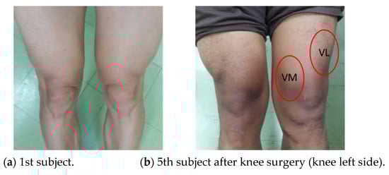 For the healthy subjects as in Figure 10, they are both male and female with an age between 26 and 50 years. Their body size and the effected knee are also different. Additional information about exercise behavior is also provided. Note that, for the 5th subject, he always exercises (playing football) 3–5 times a week, and he had knee surgery on his left knee due to hard exercise. An illustration of his knee muscles is also shown in Figure 11, where the VL and VM muscle sizes on his left side are smaller than those on his right side.