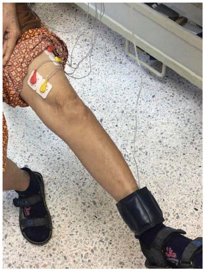 As demonstrated in Figure 2, two electrodes are placed on the VL and VM muscles, while one electrode is placed on the hand or forearm as the reference electrode. Finally, we also attach the 0.5, 1.0, 1.5 kg sandbag to the ankle (i.e., ankle wrist sandbag) to increase the workload of the knee during the test and also to study knee extension performances according to the rehabilitation progress. We note that we can change the weight of the sandbag based on the rehab program according to the physical therapists and physicians’ decision [33,34].