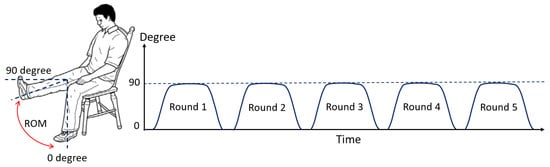 The rehabilitation program set for both healthy subjects and patients is demonstrated in Figure 13. In each test, each subject has five rounds for his or her knee movements. In each round, the subject has to move his knee angle from the starting position (or 0 degrees) to the peak position (or 90 degrees if they can). The subject is recommended to hold his knee at the peak position for 3 to 6 s, approximately, before returning back to the starting position. After the first round is done, the subject rests for a minute, and then the second round is started. The program stops when the five rounds (or 1 set) are reached and the EMG signals and knee extension ROM data are completely recoded and processed.
