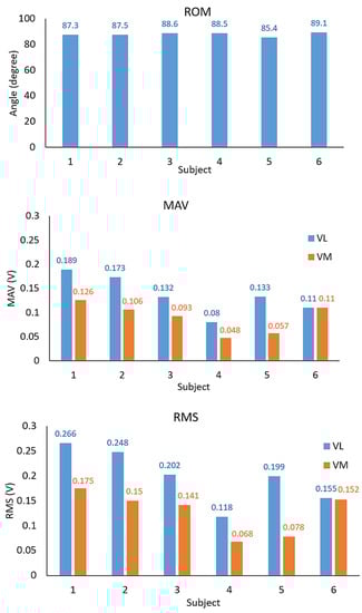 The real-time ROM results and the EMG signals of VL and VM muscles measured from the healthy subjects are demonstrated in Figure 14 and Figure 15, respectively. Table 4 and Figure 16 also show the average MAV and the RMS of the EMG signals for both VL and VM and the average ROM, and Figure 17 also illustrates an example of experimental results displayed in the GUI window.