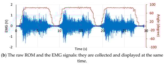 The results demonstrate that the proposed system can successfully measure the real-time ROM and EMG signals according to the rehabilitation program performed by the subjects. The results also indicate that when the subjects begin to move their knee joints against the weight of the sandbag that affects VL and VM muscles, the EMG signal amplitude then increases and the ROM can be read according to the knee movement degree. Here, the VL and VM EMG signals have the maximum amplitude when the subjects move their knee to their peak position. The EMG signal amplitude gradually decreases when the subjects hold their knee at the peak position for a period of time due to the fatigue of their muscles (for some subjects). Finally, the EMG signal amplitude then significantly decreases to the lowest level when the subjects return to the starting position. As seen in Figure 14 and Figure 15, the ROM results also correlate with the EMG results, where the subjects have a ROM movement degree of 0 to 80, or nearly 90 degrees, approximately. We note that, from our implementation, Figure 17 also confirms that the ROM and the EMG can be collected and displayed at the same time.