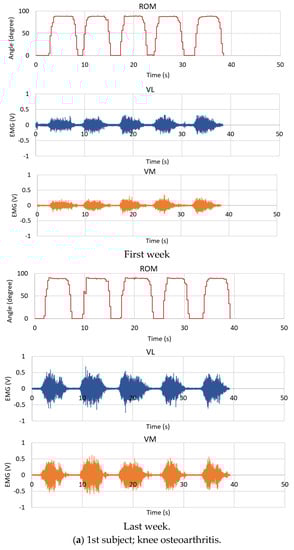 Limitations of this study can be summarized in three points. First, since the surface EMG device and the angle sensor device are placed at different positions and they are connected to the NI-myRIO via wire communication to increase usability and convenience, they should be replaced by a wireless connection. Second, to more accurately use the surface EMG electrodes, they should be placed on the correct positions of the VL and VM muscles. In this work, physical therapists and physicians are asked to mark and set the optimal positions. Therefore, if patients use the device by themselves, they should be appropriately trained first. Finally, the results obtained from this work are the real-time EMG with MAV and RMS and the ROM data. Extracted information from such data for greater utilization should be provided; for example, the ROM variation, the time period the user can hold his or her knee above the threshold level, etc.