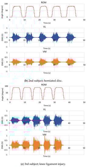 The results from Table 4 and Figure 16 also reveal that the amplitude of the VL EMG signal of each subject is larger than the case of the VM EMG signal. Here, this is because the subject put more force from the VL muscle against the sandbag weight than the VM muscle. From Figure 15 and Figure 16, we can also observe that the first subject who always exercises 3–5 times a week has high EMG signal amplitude and smoothed ROM results. Both VL and VM signal amplitudes are stable when he holds his knee at the peak position for a period of time. Also, the ROM is smooth for five rounds of his tests. The 6th subject, who always exercises, also performs well, as indicated by her EMG and ROM results. For the 4th subject, since he has a quite high weight of 110 kg, his EMG signals captured from his muscles are not very big, like in the cases of the 1st and 6th subjects. Finally, for the 5th subject, although he had knee surgery on his left knee, he had passed the rehabilitation process and he always exercises 3–5 times a week. Thus, he obtains good EMG signals and ROM results also. However, when compared to the first subject, the VL and VM EMG signal amplitudes are lower. We note that, as shown in Figure 11, the VM muscle of the knee left side of the 5th subject is significantly smaller than the VM muscle of his knee right side.
