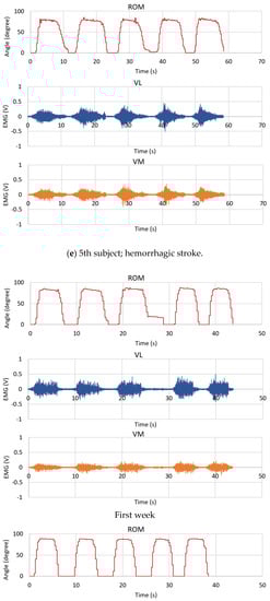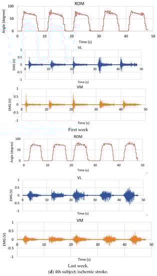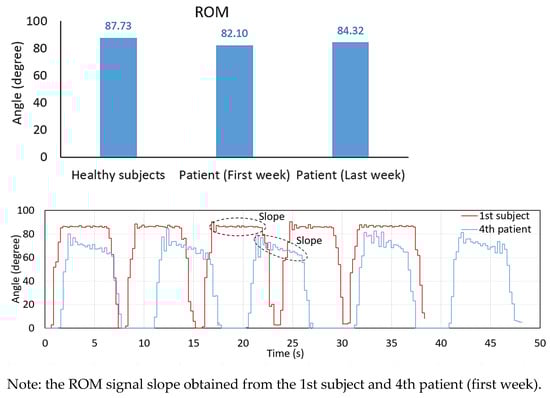 The comparison of the average ROM, the MAV and the RMS of the EMG signals between the healthy subject group and the patient group is also illustrated in Table 7 and Figure 19. The results here demonstrate that we can monitor and track the rehabilitation progress of the patients compared with themselves and the healthy subject group. As in Table 7, the ROM averaged from all patients is 82.1 for the first week and then moves to 84.317 for the last week. However, if we consider the healthy subjects’ information with the ROM of 87.73, the patient group can still practice themselves to increase to a higher level of the ROM, as much as possible. For the EMG results of the patients, both MAV and RMS of the VL and VM muscles can be improved by rehabilitation. Figure 19 shows the ROM signal slope obtained from the 1st healthy subject and the 4th patient with ischemic stroke (first week). Here, the signal slope of the 4th patient is not strong during the duration of sustained contraction (holding his posture at the peak position for some period of time), compared to the 1st subject. However, after rehabilitation, the ROM of the 4th patient improved, as seen in Figure 18d. Moreover, the MAV and RMS of the EMG signals are all improved as well.