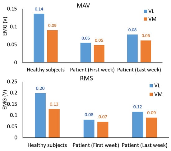 As we mentioned in Section 3, the patients who received treatment at the rehabilitation department at Trang Hospital in Thailand were tested three times on different days to track their knee rehabilitation progress. They were tested for one month, i.e., the first week, the middle week, and the last week of the month. Before the first test, patients had been continuously practicing for the rehabilitation under the supervision of physical therapists and physicians, Table 6. Table 5 and Table 6 and Figure 18 show the results obtained from the first week and the last week of the patients’ rehabilitation, where the average ROM, the MAV, and the RMS of both VL and VM EMG signals are demonstrated. For the patients in group A, the average ROMs are 85.5 (first week) and 87.167 (last week), while they are 78.7 and 81.467 for the patients in group B. In cases of EMG results as presented by the MAV and the RMS values, on average, they are different from the first week to the last week for both VL and VM muscles, as summarized in Table 6 and also in Table 5. For the second patient with a herniated disc, almost all EMG results are increased, but the MAV and the RMS of the VM muscle of the first week and the last week are not different (MAV: 0.068; first week, 0.067; last week) and (RMS: 0.094, 0.096), while the MAV and the RMS of the VL are increased. Thus, experts can see these results and give more consideration to this case.
