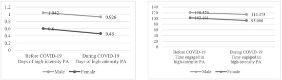 Changes in high-intensity PA by gender before and during COVID-19. Note: Time represents the number of minutes exercised per week.