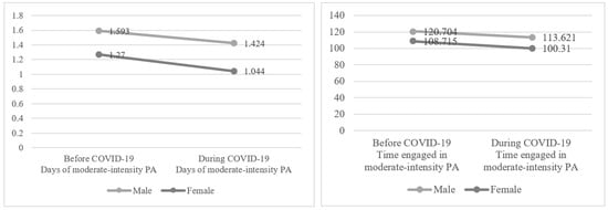 Changes in moderate-intensity PA by gender before and during COVID-19. Note: Time represents the number of minutes exercised per week.